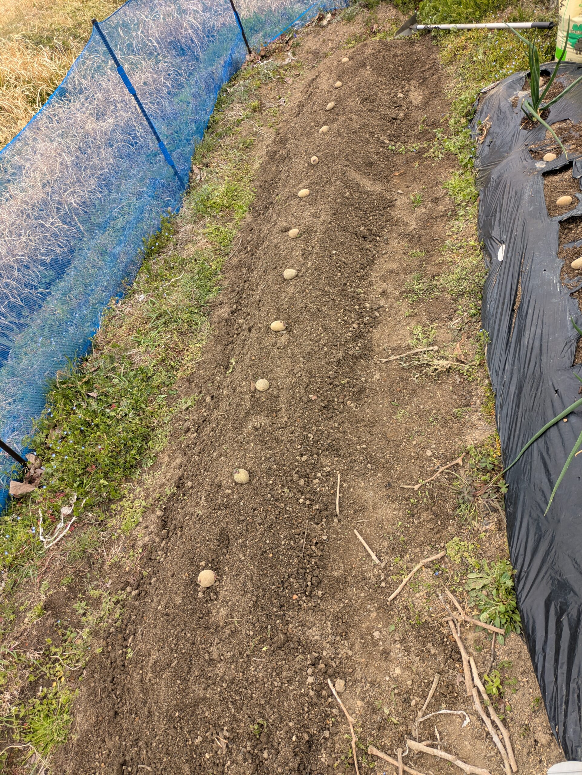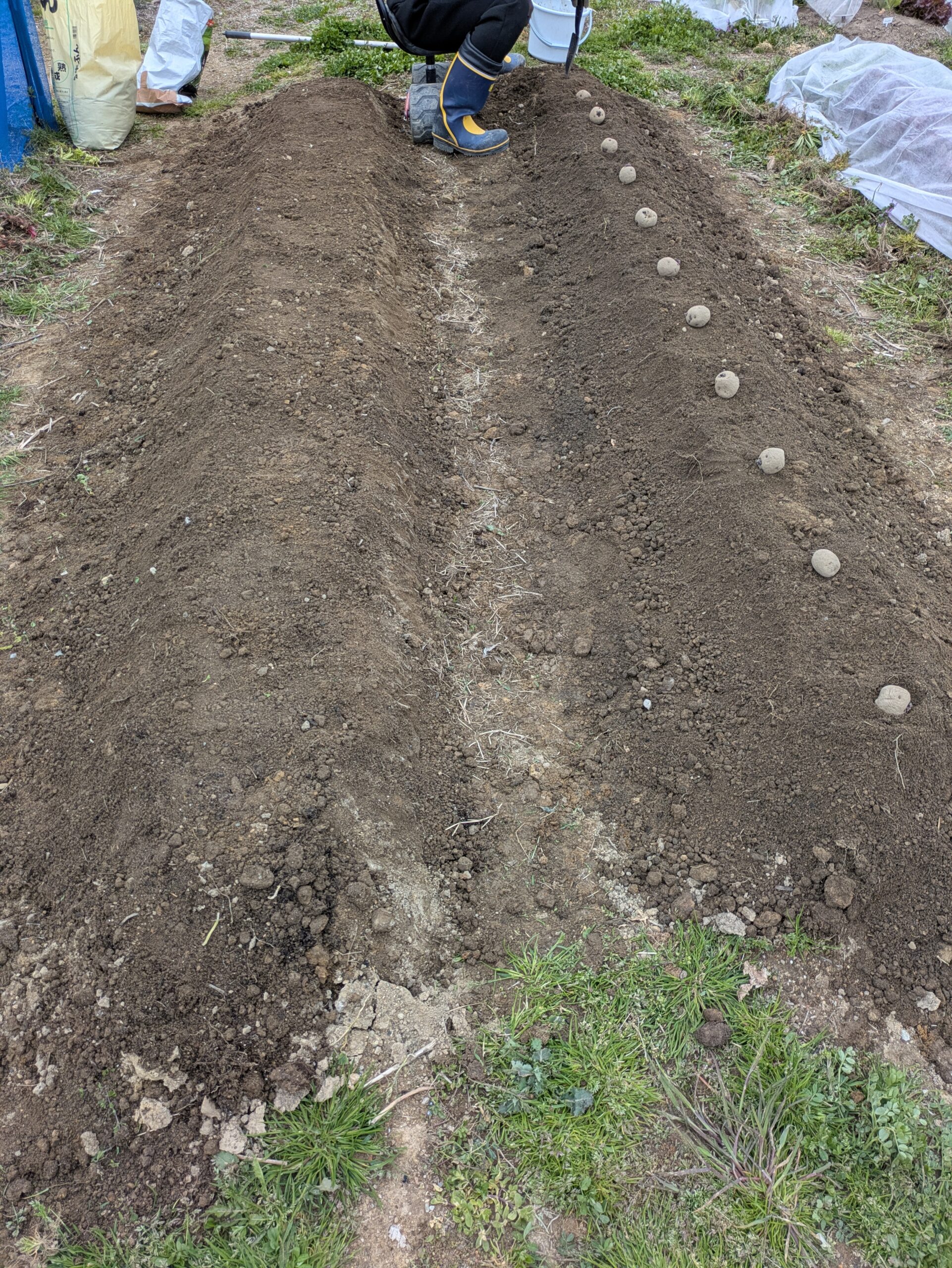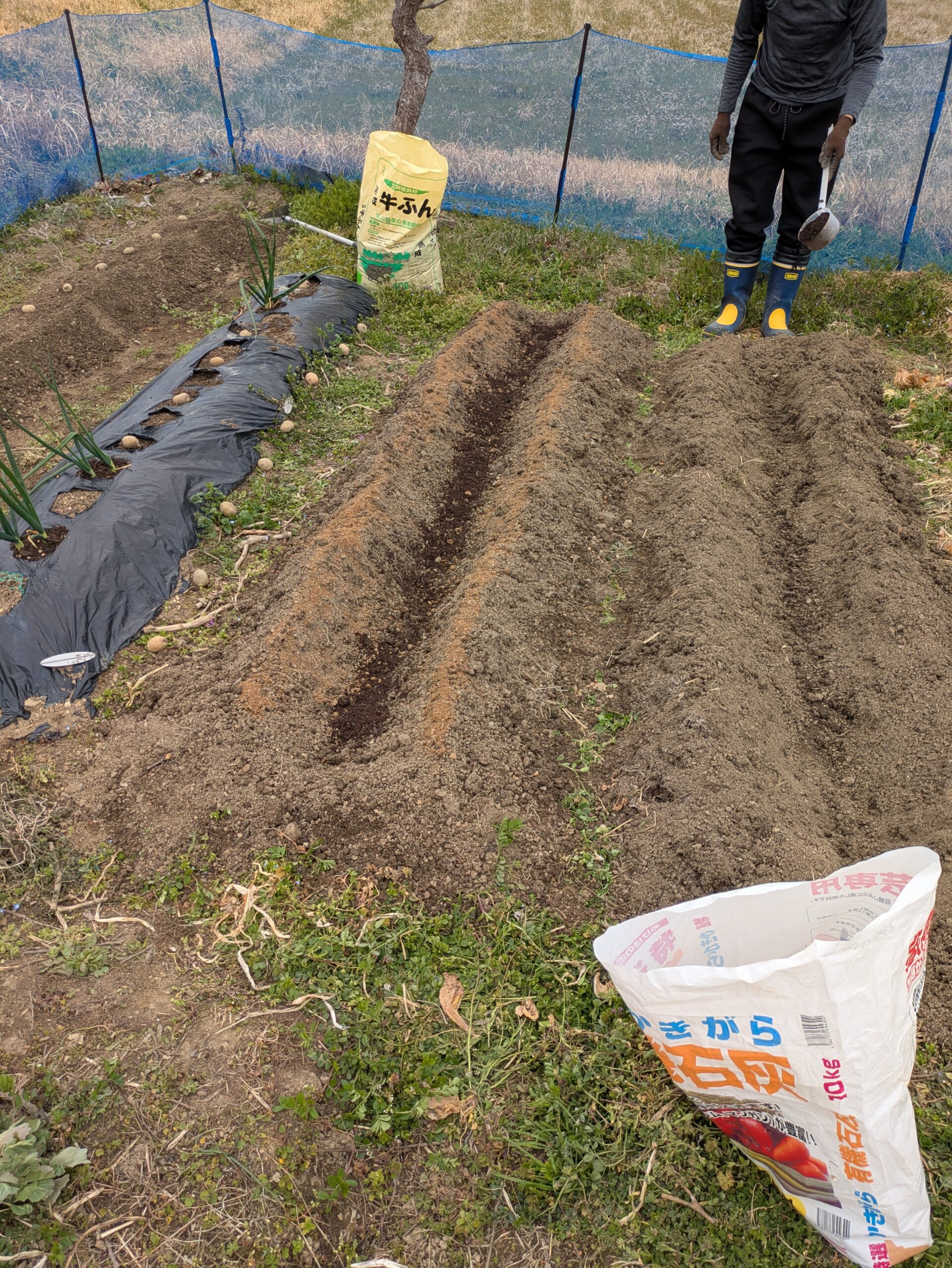 以前このコラム内でお知らせしていました、神戸大学育成ジャガイモ新品種『はりまる』と、メークインとキタアカリの植付けをしました。今回ぼかし肥を仕込んでおいたので、それを使って植えました。