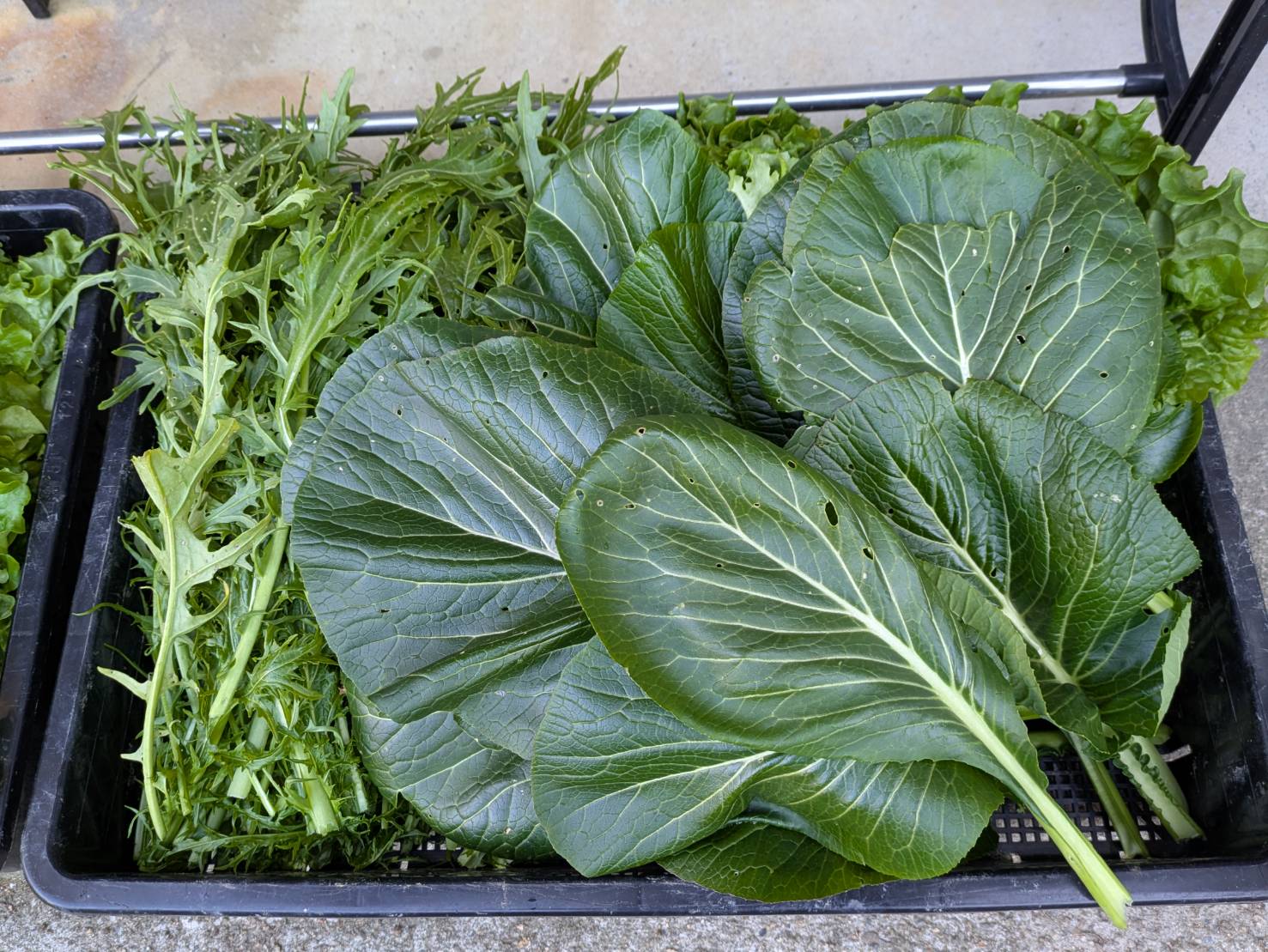 虹色菜、スティックセニョール(茎ブロッコリー)、リーフレタス、キャベツ、カラシナとコマツナ。