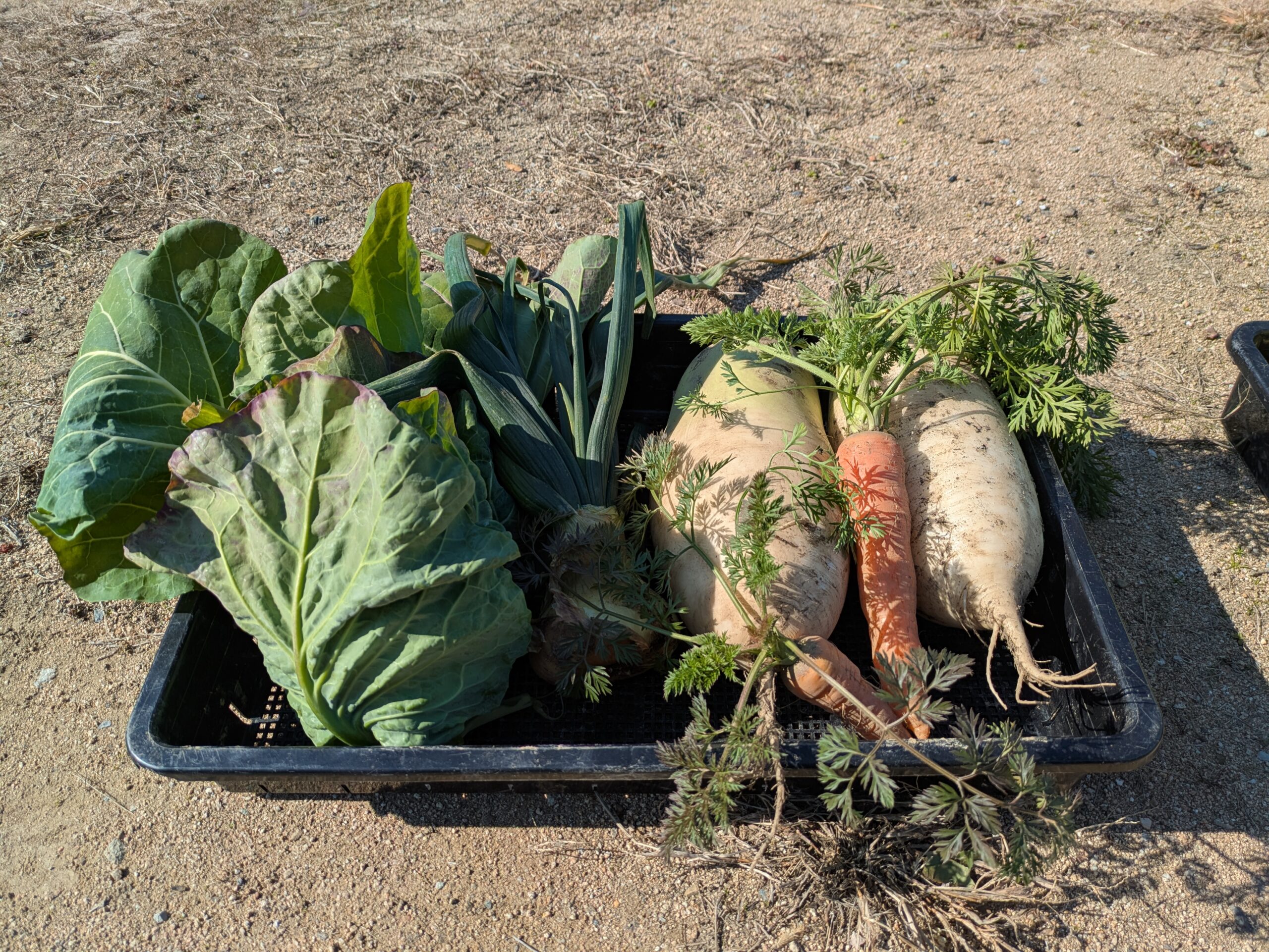 ダイコン、キャベツ、ハクサイ、ニンジン、ホームタマネギ、ネギ、ほうれんソウ、スティックセニョールの側花蕾、ゴボウ。まだ穫れるけれど消費出来ないのでまた今度(^_^;)